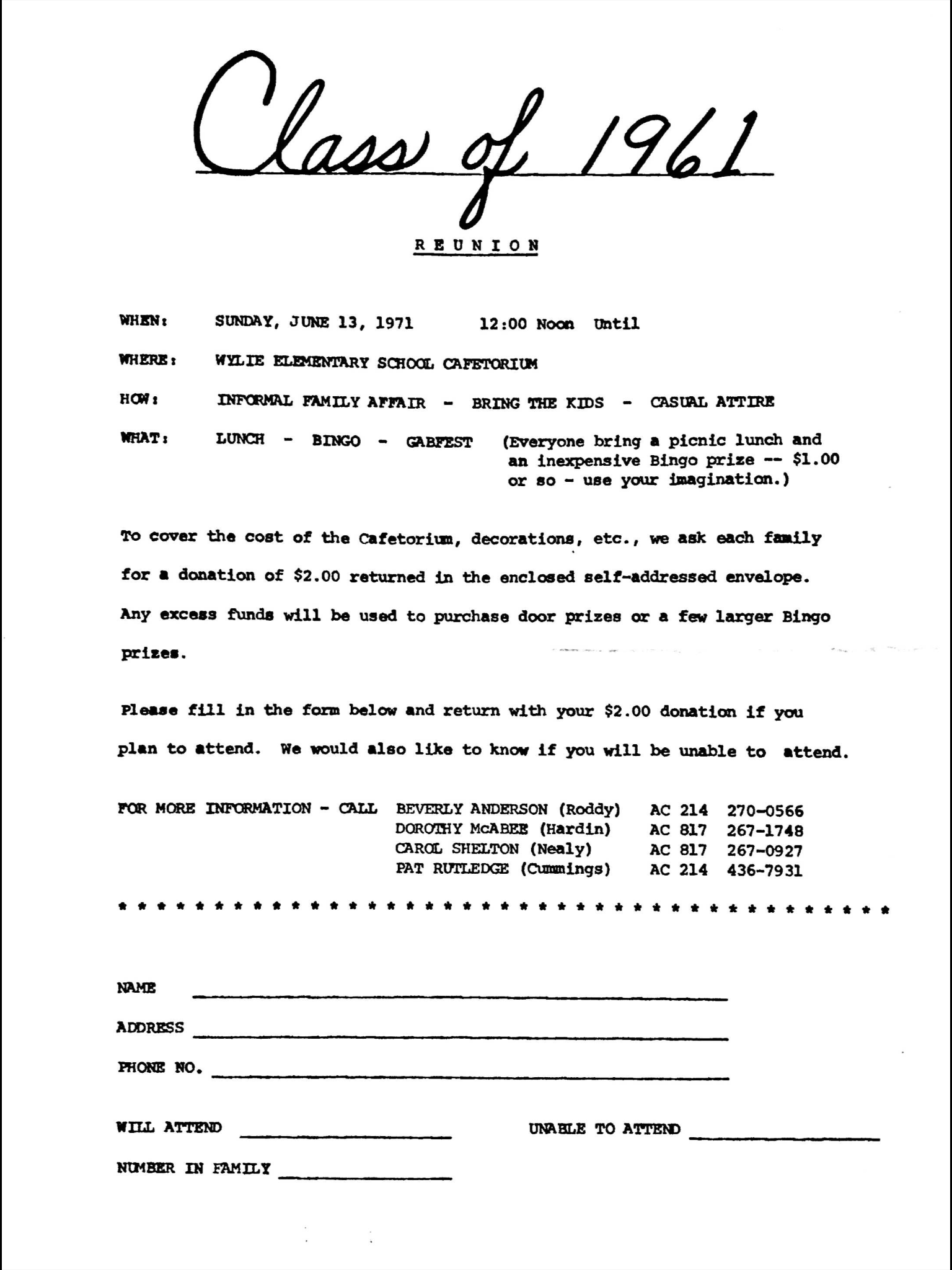 The Wylie High School Class of 1961 has had many reunions, most well attended. It is always great to spend time remembering our school years and catching up on where life has taken each of us. If anyone has pictures they would like to have posted, send them by email.